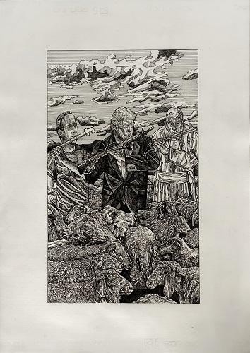 “Va musitando sus quejas, Con su flautín de carrizo, Seguido por sus ovejas, Como si fuera un hechizo”. El artista se enfrentas a dos situaciones: el dibujo y no querer ser literal, hacer una interpretación. Es un doble proceso intelectual y en cuanto a ejecución: “En este contexto de nueva sociedad, las fuerzas que nos siguen guiando son la religión, la política y ahora las redes sociales son estas nuevas fuerzas. Están estos tres personajes tocando a manera de sátira, a manera caricaturesca, van tocando, en este caso, Mark Zuckerberg con la flauta, con el logotipo de Facebook. Trump con su nacionalismo y Estados Unidos inmiscuido en los conflictos bélicos, lleva un rifle. El proceso lo disfruté muchísimo”.