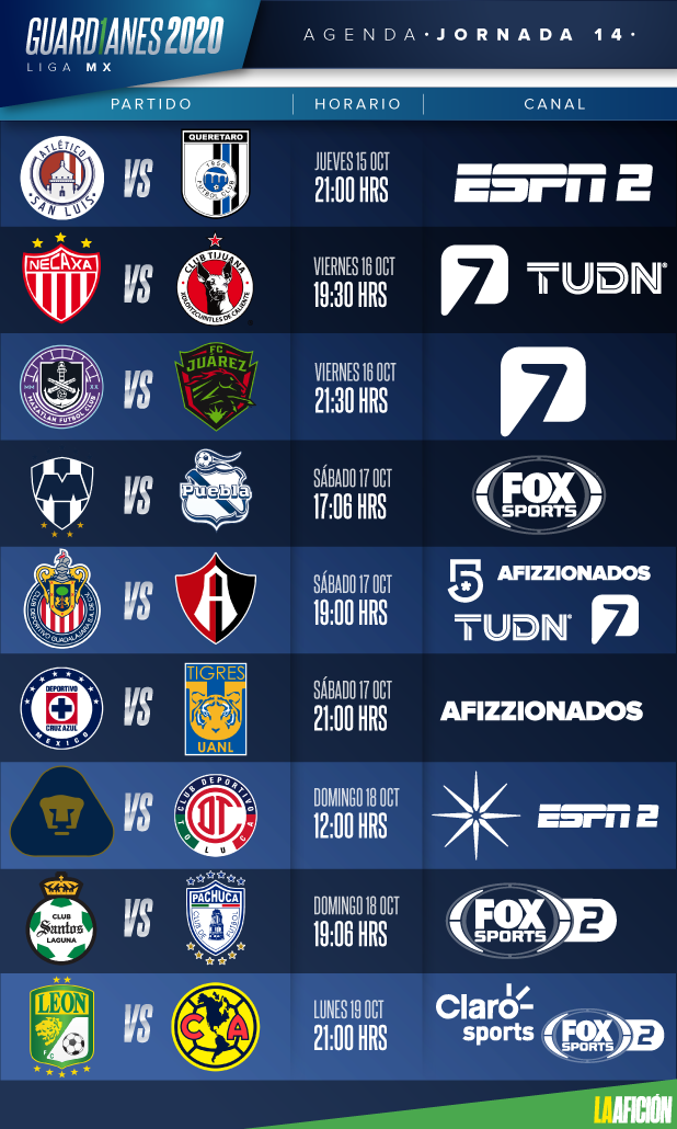 Tras los 15 días de la Fecha FIFA, la Liga MX reanuda actividades en su certamen de Guardianes 2020, con la la jornada 14, misma que marca -paradójicamente- el inicio de la recta final del torneo. La fecha empieza en la cancha del Alfonso Lastras, con el llamado Clásico del Centro o Clásico de la carretera 57, esto cuando el Atlético de San Luis enfrente al Querétaro.