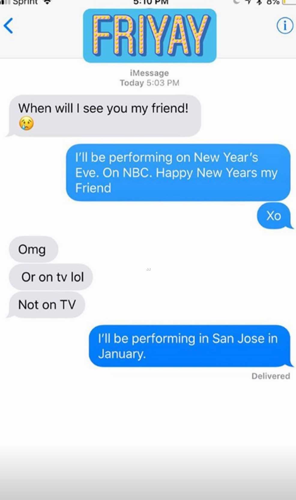 En seguida Bebe Rexha compartió la captura de la conversación del acosador quien se refiere a ella como su “amiga” y le pregunta cuándo podría verla, ella le respondió que daría un concierto en año nuevo, sin embargo él insiste en que desea verla.