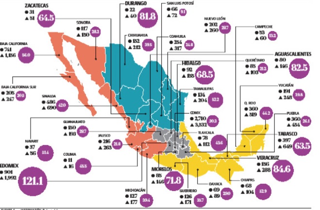 En la región oeste (BC, BCS, Sinaloa, Jalisco, Michoacán, Sonora, Nayarit y Colima) las infecciones crecieron 42 por ciento; mientras que en la zona norte (Coahuila, NL, Chihuahua, Tamaulipas, Aguascalientes, SLP, Zacatecas y Durango) tuvieron una subida de solo 38.4 por ciento.