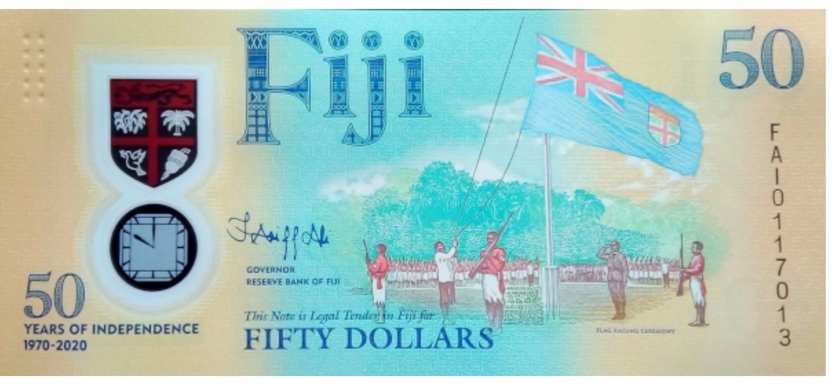 Este billete del país del Pacífico Sur fue emitido en 2020 para conmemorar el 50 aniversario de su independencia. Tiene un valor nominal de 50 dólares y está hecho de polímero; sin embargo, no cuenta con ninguna medida de seguridad. En él predominan los colores naranja, azul, rojo y marrón.