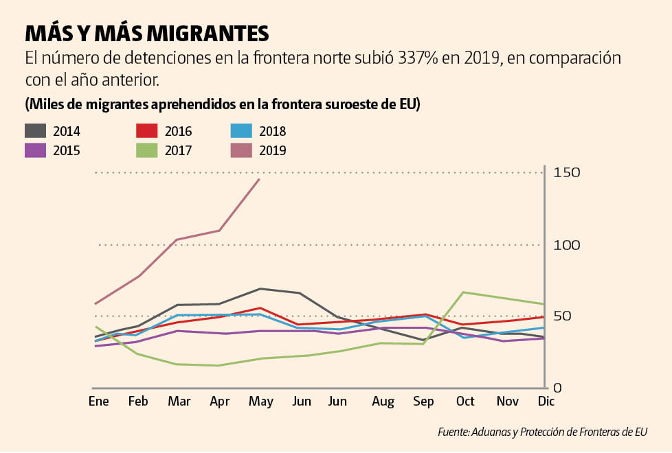 El aumento alarmó a Trump, especialmente porque el número total de detenciones de migrantes en la frontera de EU en mayo alcanzó la cifra de 144,278, un aumento de 32% en comparación con abril, con un número de niños y familias centroamericanas detenidos que subió 337% en comparación con el año anterior.