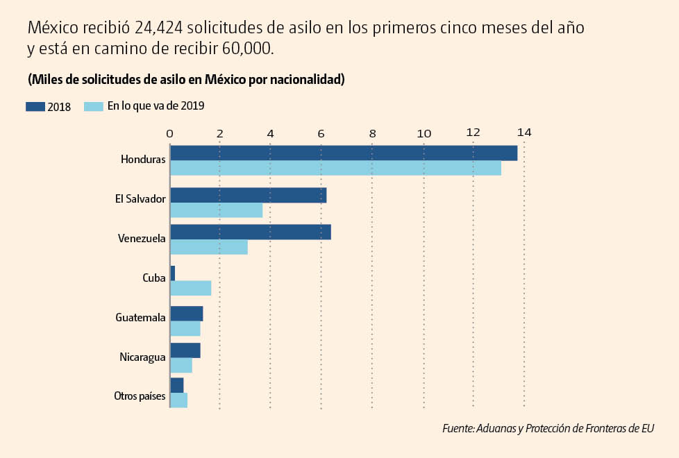 México quedó indundado con 24,424 solicitudes de asilo en cinco meses, casi las 29,647 de todo 2018. El acuerdo con EU pondrá nuevas barreras a los migrantes.