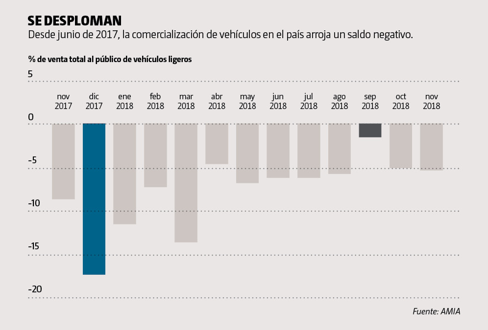 Las ventas de automóviles en México hilaron 19 meses consecutivos de números rojos en diciembre pasado, luego de registrar niveles récord en 2015 y 2016, cuando se alcanzaron crecimientos de hasta 9%, según la Asociación Mexicana de la Industria Automotriz (AMIA).