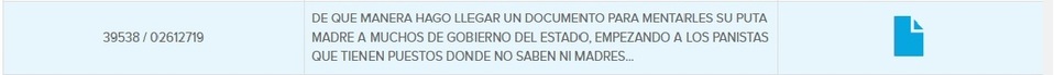 En la petición que hace el usuario se lee: "DE QUE MANERA HAGO LLEGAR UN DOCUMENTO PARA MENTARLES SU..... A MUCHOS DE GOBIERNO DEL ESTADO, EMPEZANDO A LOS PANISTAS QUE TIENEN PUESTOS DONDE NO SABEN NI MADRES..."