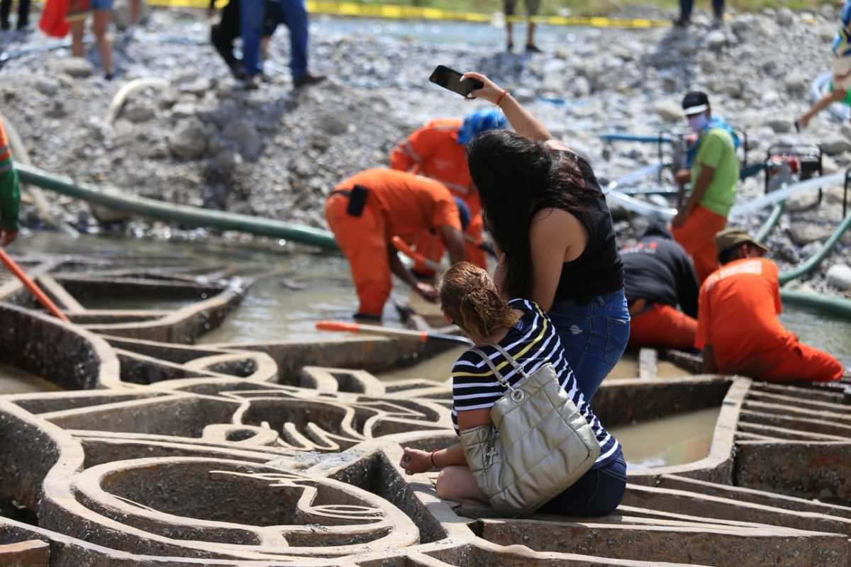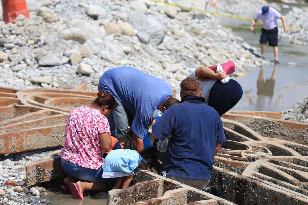 Hay quienes aprovechan el momento para tomarse una selfie o bendecir a los más pequeños, mientras que otros se sumergen en el agua que aún pasa por el río y se refrescan.