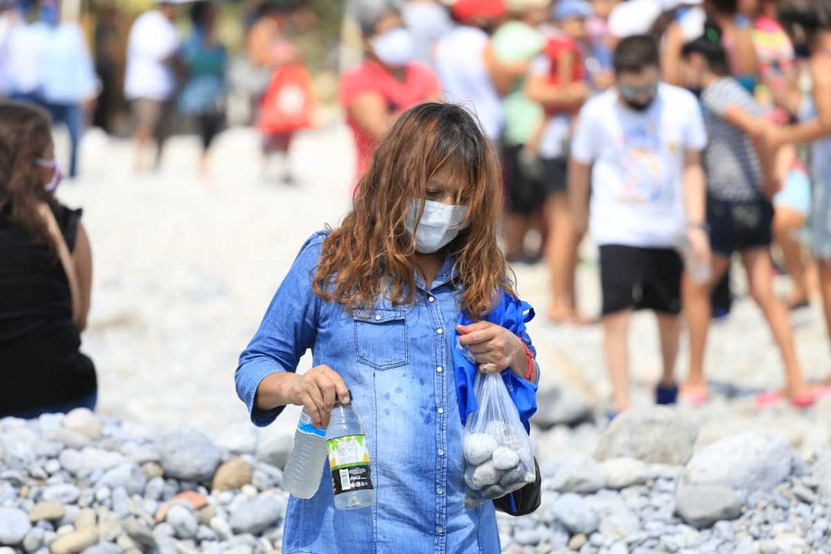 Mujeres, hombres y niños, algunos con cubrebocas, pero sin respetar la sana distancia, realizan una fila para poder acceder al sitio, en donde recolectan agua y piedras, señalando que están bendecidas.