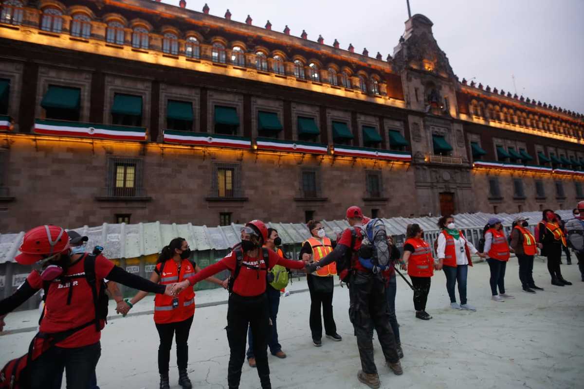 Integrantes de la brigada Marabunta y personal del gobierno capitalino realizaron una valla humana alrededor de la plancha del Zócalo de la Ciudad de México en señal de que la marcha llegó a su fin y las manifestantes se retiren del lugar.