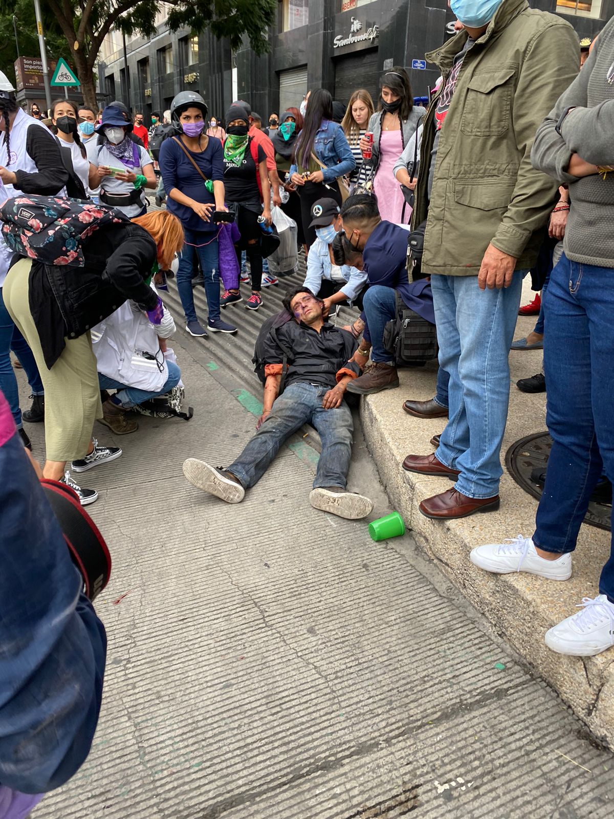 Un hombre de entre 35 o 40 años fue remitido al sector médico debido a que durante la marcha de esta tarde recibió un golpe presuntamente con martillo en la cabeza. La persona, quien posiblemente se encuentre en situación de calle, fue atendido por elementos del ERUM y auxiliado por civiles que circulaban en la zona.