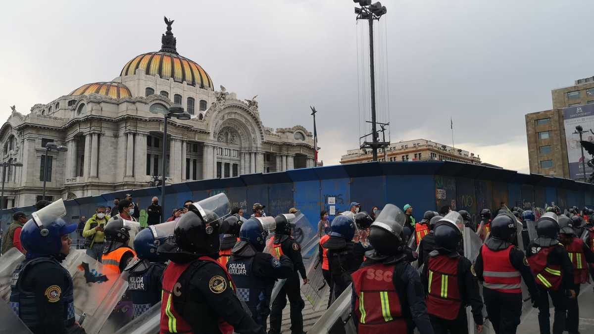 Integrantes de la policía capitalina del grupo Atenea se encuentran resguardando la marcha en el Centro Histórico, a la altura de Bellas Artes. Cabe destacar que dicho inmueble fue cercado con vallas de protección durante días previos.