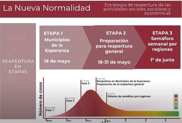 La secretaria de Economía, Graciela Márquez informó sobre lo que será la "Nueva Normalidad", la estrategia de reapertura de las actividades sociales, escolares y económicas. Explicó que la primera etapa (el 18 de mayo) será la reactivación en 269 "Municipios de la Esperanza" que no tienen contagio; la segunda (del 18 al 31 de mayo), para reiniciar labores de los trabajadores de empresas las cuales "tendrán que hacer protocolos saber qué hacer en cada momento" y la tercera etapa (01 de junio) habrá un sistema de semáforos por regiones.